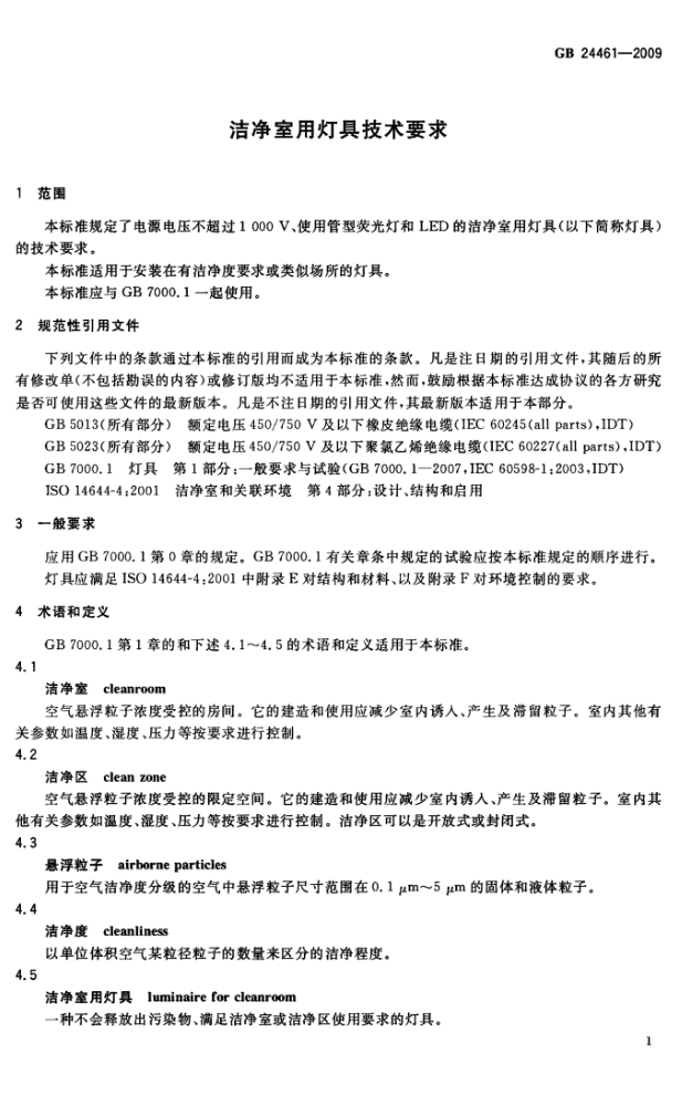 潔凈室用燈具技術(shù)要求規(guī)范標準 GB24461-2009 (燈具技術(shù)要求)